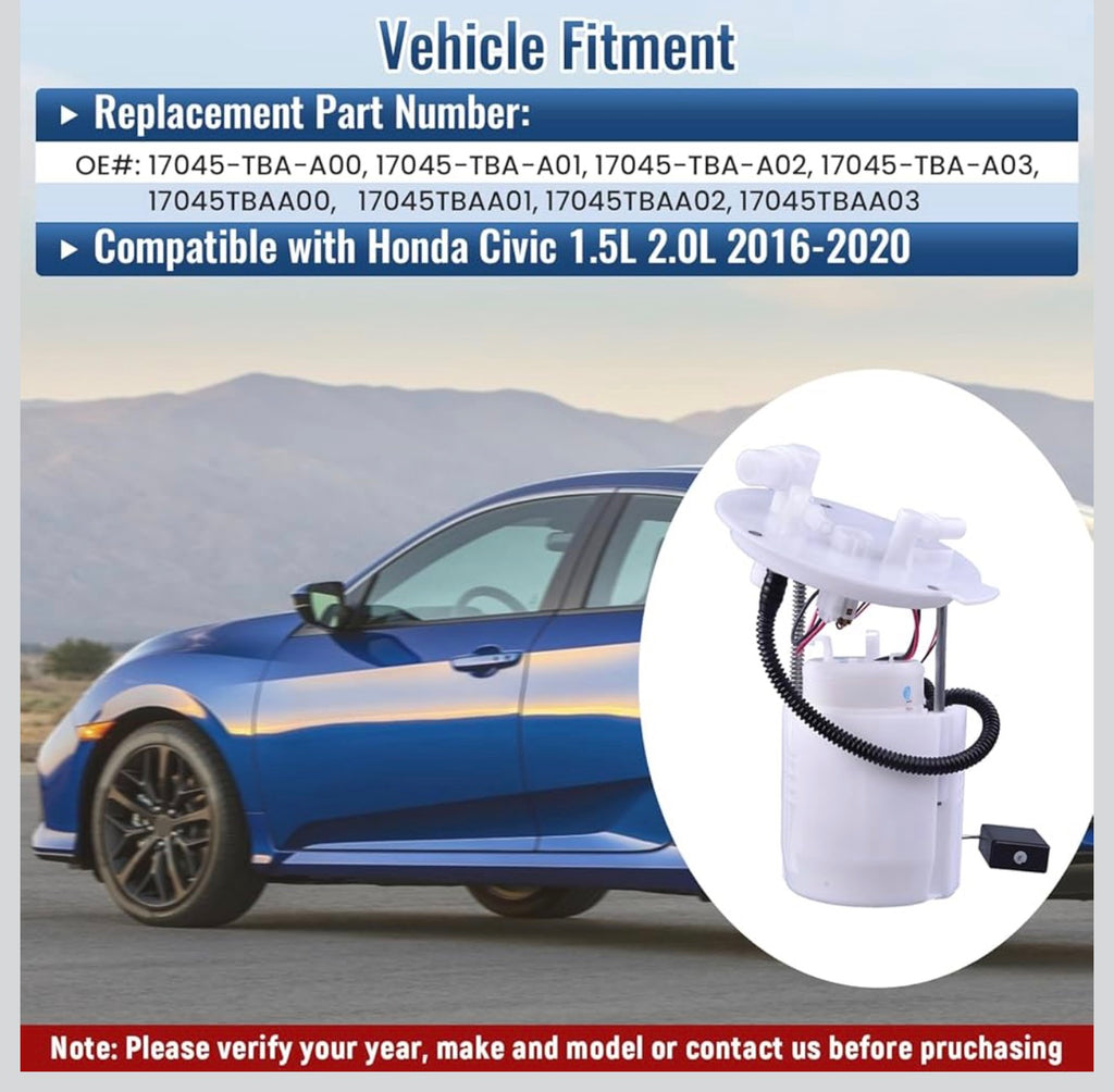 Upgrade your Honda Civic with this Fuel Pump Module Assembly, compatible with models 2016-2020. Designed with precision and reliability in mind, it is a perfect replacement for 17045-TBA-A01, 17045-TBA-A02, and 17045-TBA-A03. Experience optimal fuel efficiency and performance with its 1.5L and 2.0L engines.